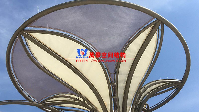 該項目膜結構共有9個單體結構,分別由1個大型花朵、4個中型花朵、4個小型花朵組成,膜結構建筑面積約為400平方米。