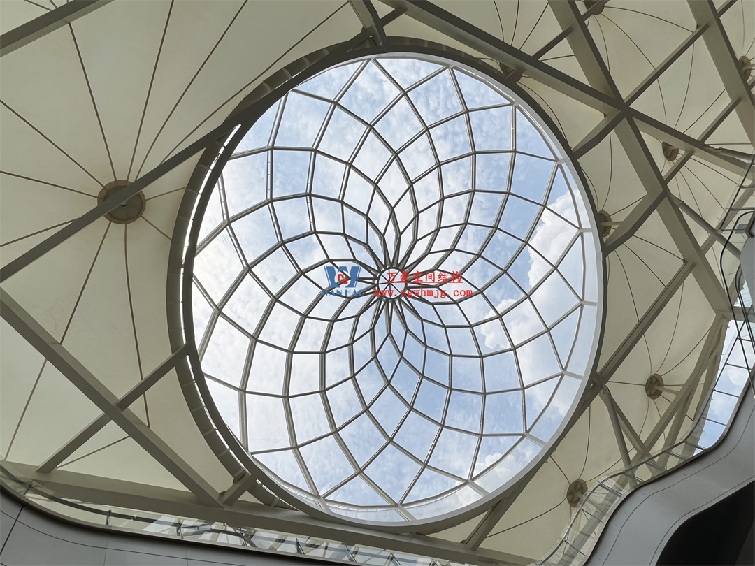 3、適應大跨度:膜結(jié)構(gòu)材質(zhì)輕,適合大跨度的建筑設(shè)計。在大型商業(yè)街區(qū)中,常常需要建造開闊的空間,膜結(jié)構(gòu)穹頂能夠輕松滿足這一需求,無需過多的支撐結(jié)構(gòu),使空間更加開闊、通透。