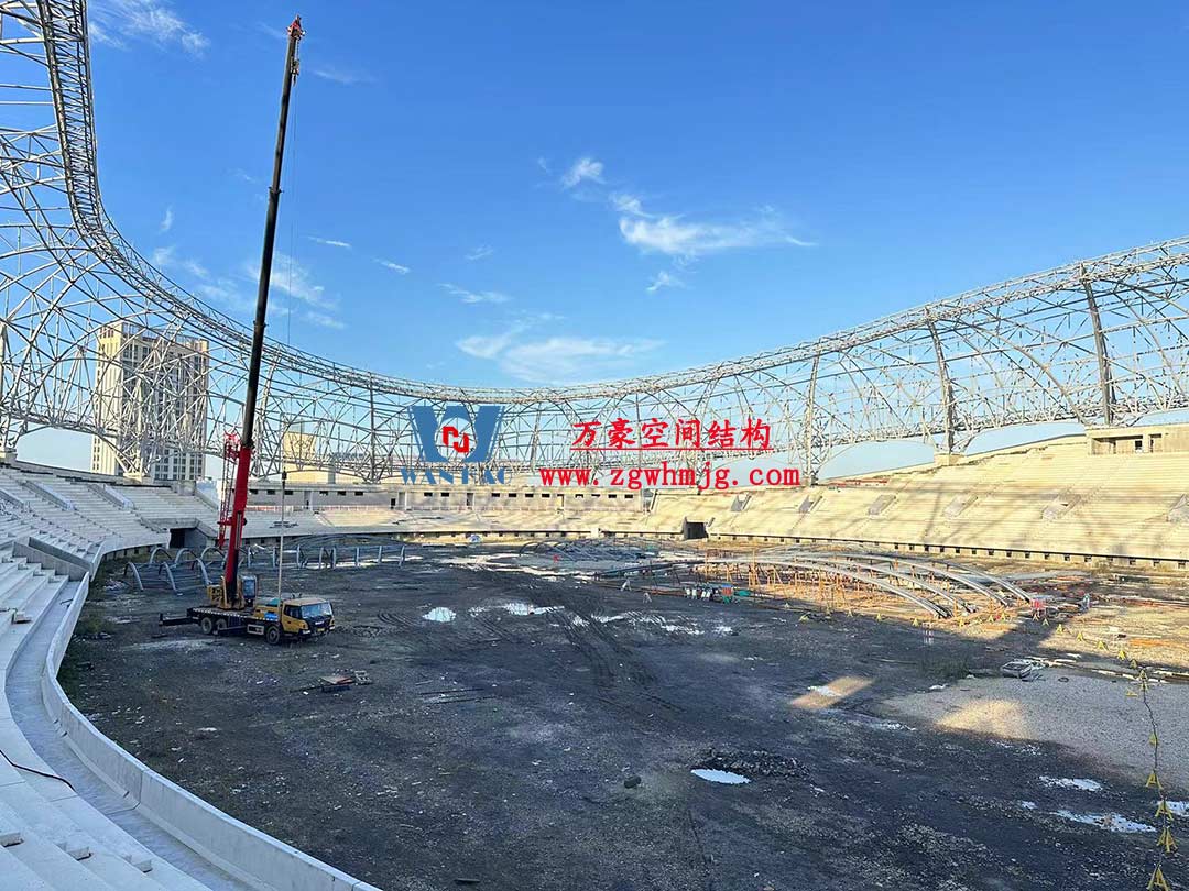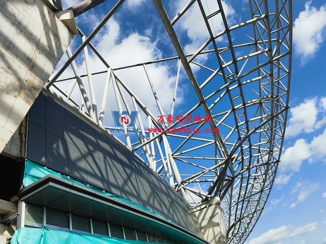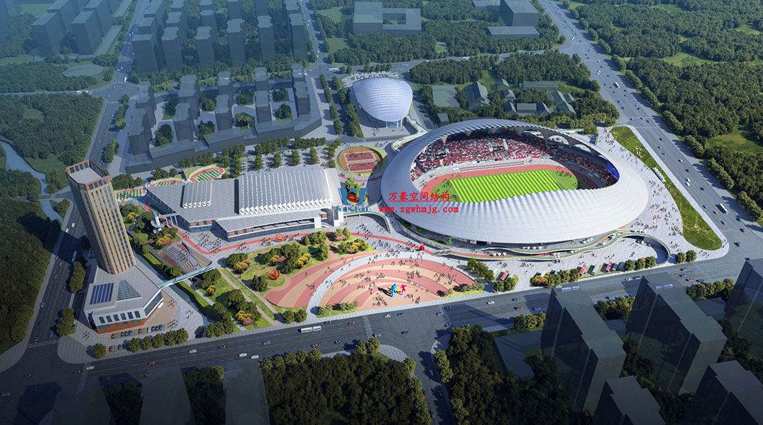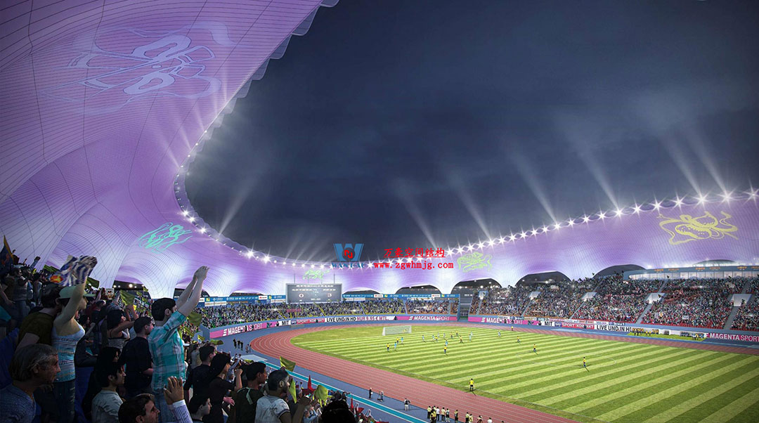 山東蓬萊體育場坐落于煙臺黃渤海新區蓬萊示范區,該體育中心占地約200畝,總建筑面積5.6萬平方米。蓬萊體育場以“漂浮的仙島”為設計理念,運用龍骨優化與雙曲鋁板單元化裝配工藝,以連續曲面構成主體造型,頂部采用雙層PTFE膜材張拉完成,42500平方米流線型穹頂,以靈動曲線呼應黃海波濤
